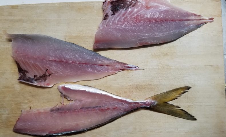 三枚おろしをすると身の部分が二枚、真ん中の骨の部分が一枚とれます。