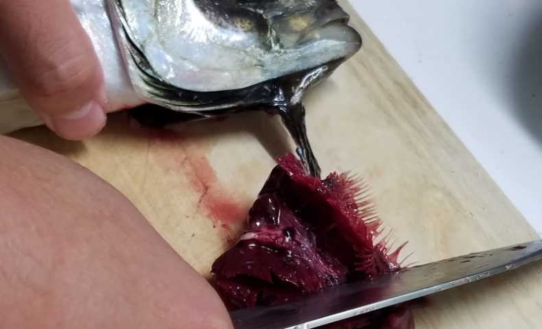 包丁とまな板でエラを挟み込み、魚を引っ張るとエラが抜けます。