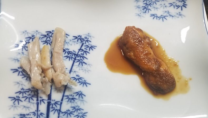 左がホウボウの浮き袋の湯引き、右がホウボウの卵の煮付けです。