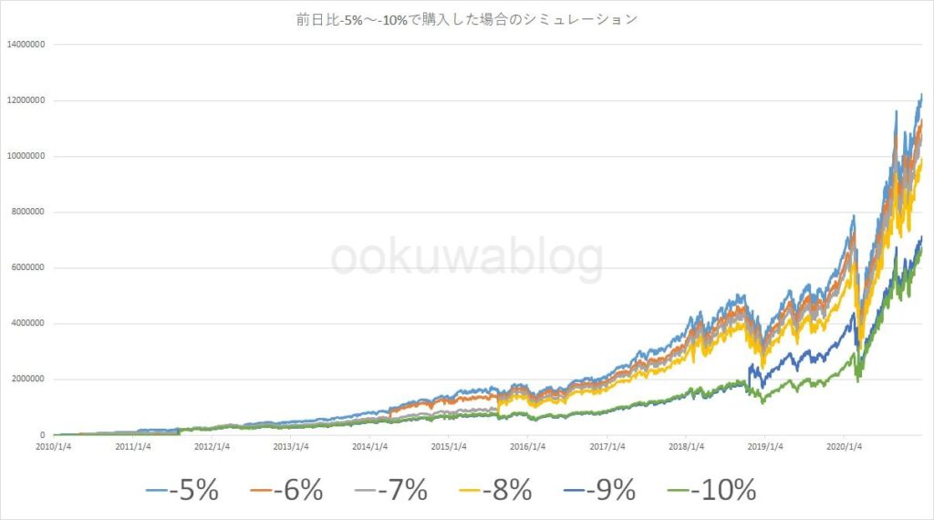 このルールで今回は前日比-5%,-6%,-7%,-8%,-9%,10%のタイミングで購入する6パターンで検証してみます。