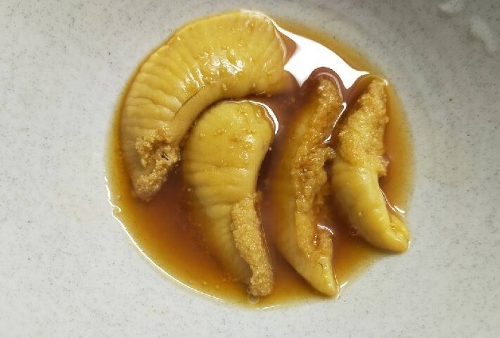 ぐらいを入れて沸騰させて、そこに先ほどの卵巣と精巣を入れ火が通るまで5分程度煮込んだら完成です!