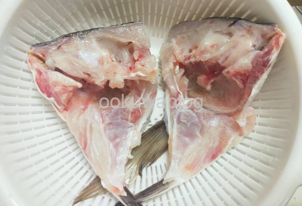頭も身も一応臭いを取るために全体に強めに塩をまぶして、ザルにおいて冷蔵庫で10分ほど置きました。