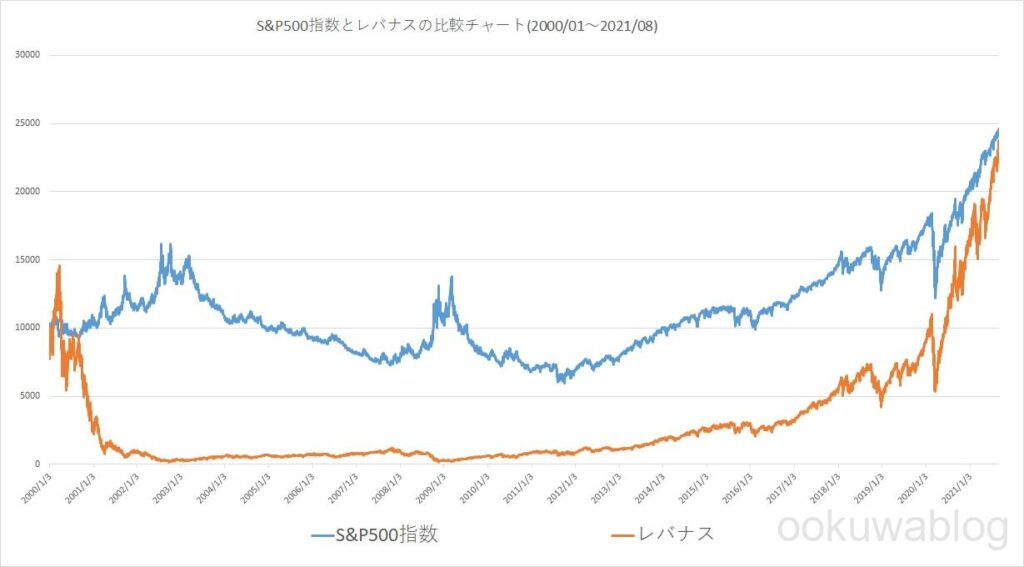以下は2000年1月初にS&P500とレバナスをそれぞれ1万円分購入したと想定した直近20年程度の2000年1月~2021年8月までのチャートです。
