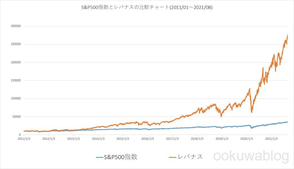 S&P500指数とレバナスのパフォーマンスをチャートで比較します。